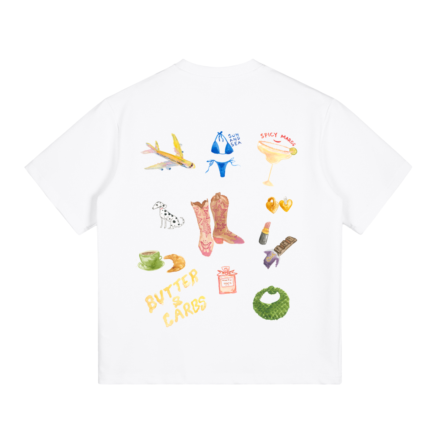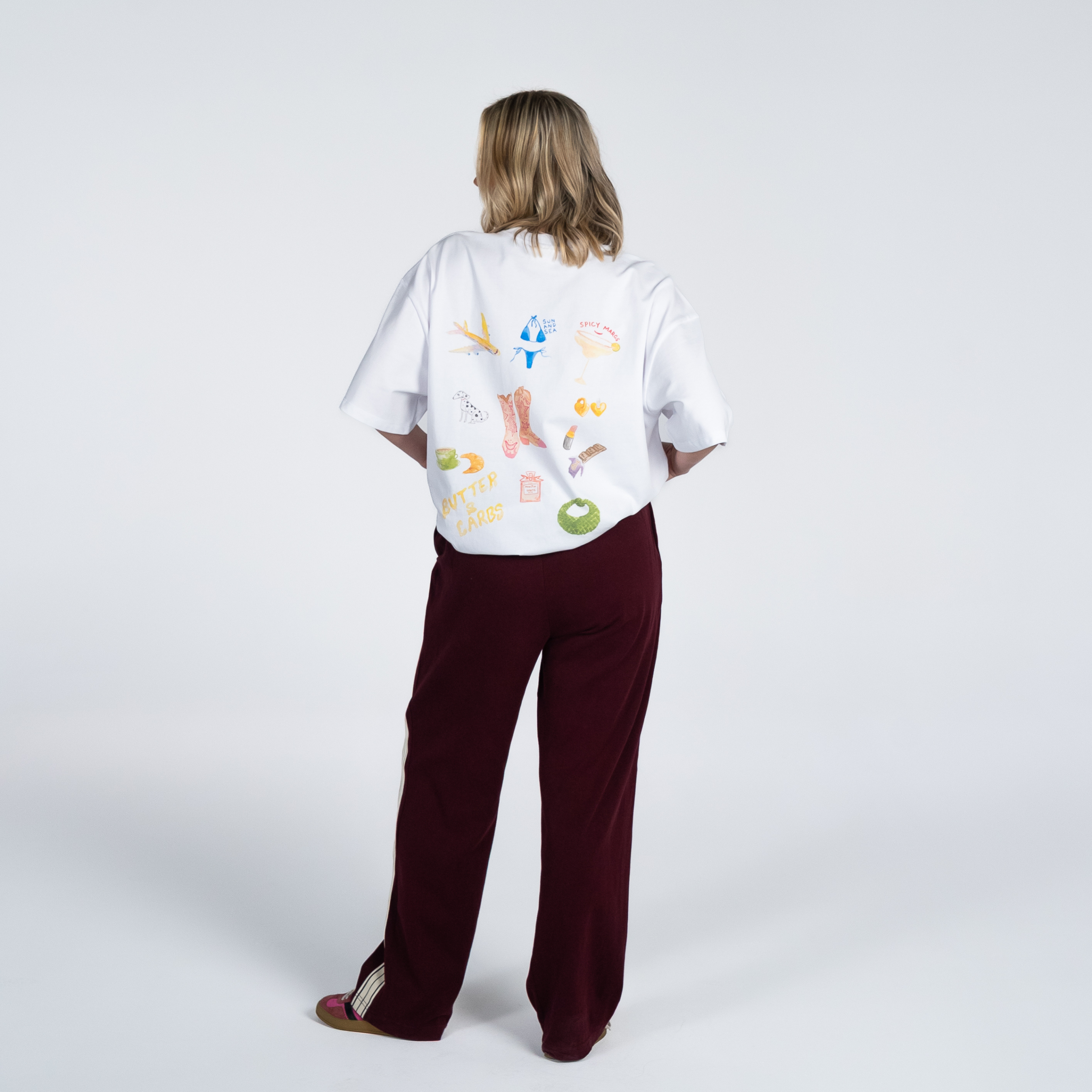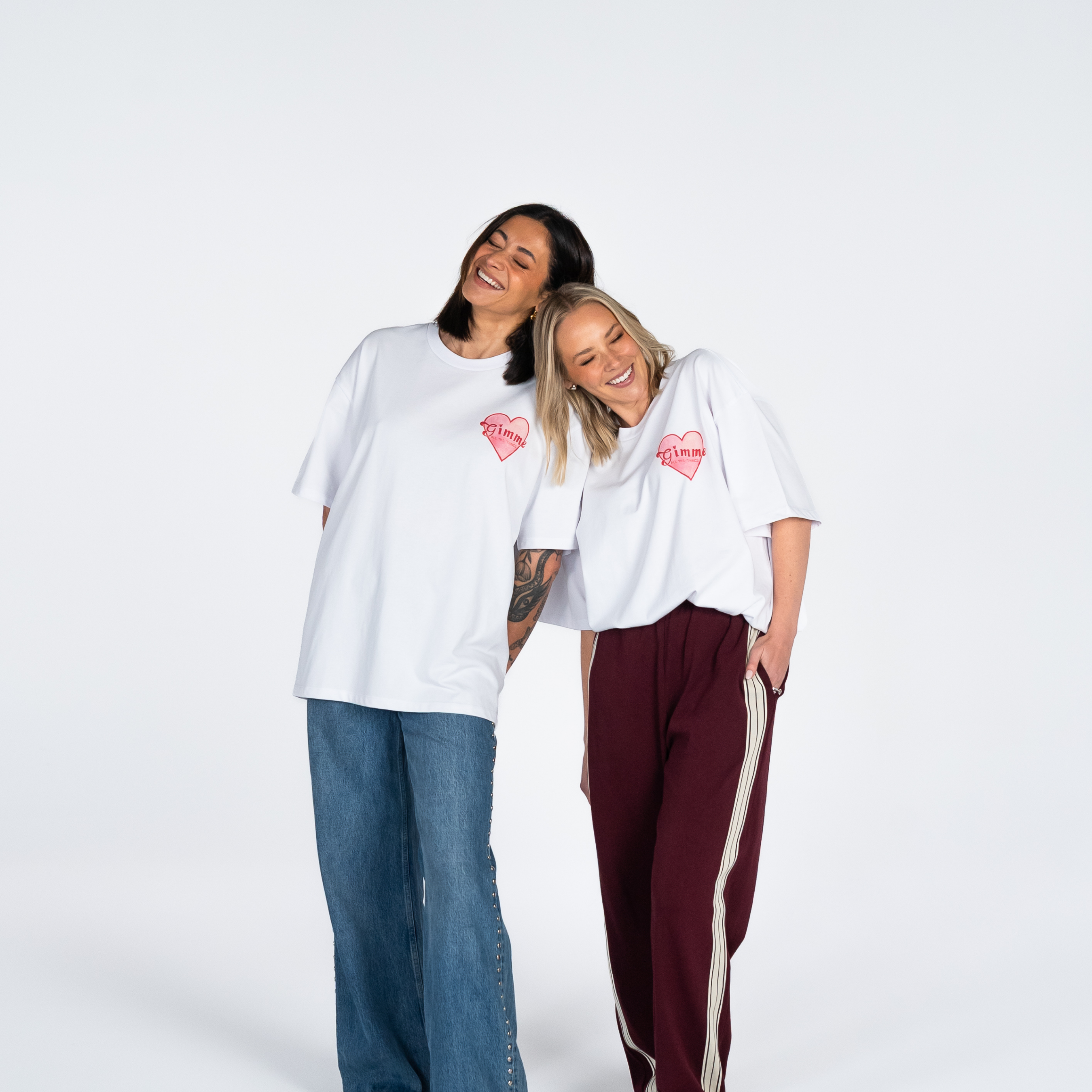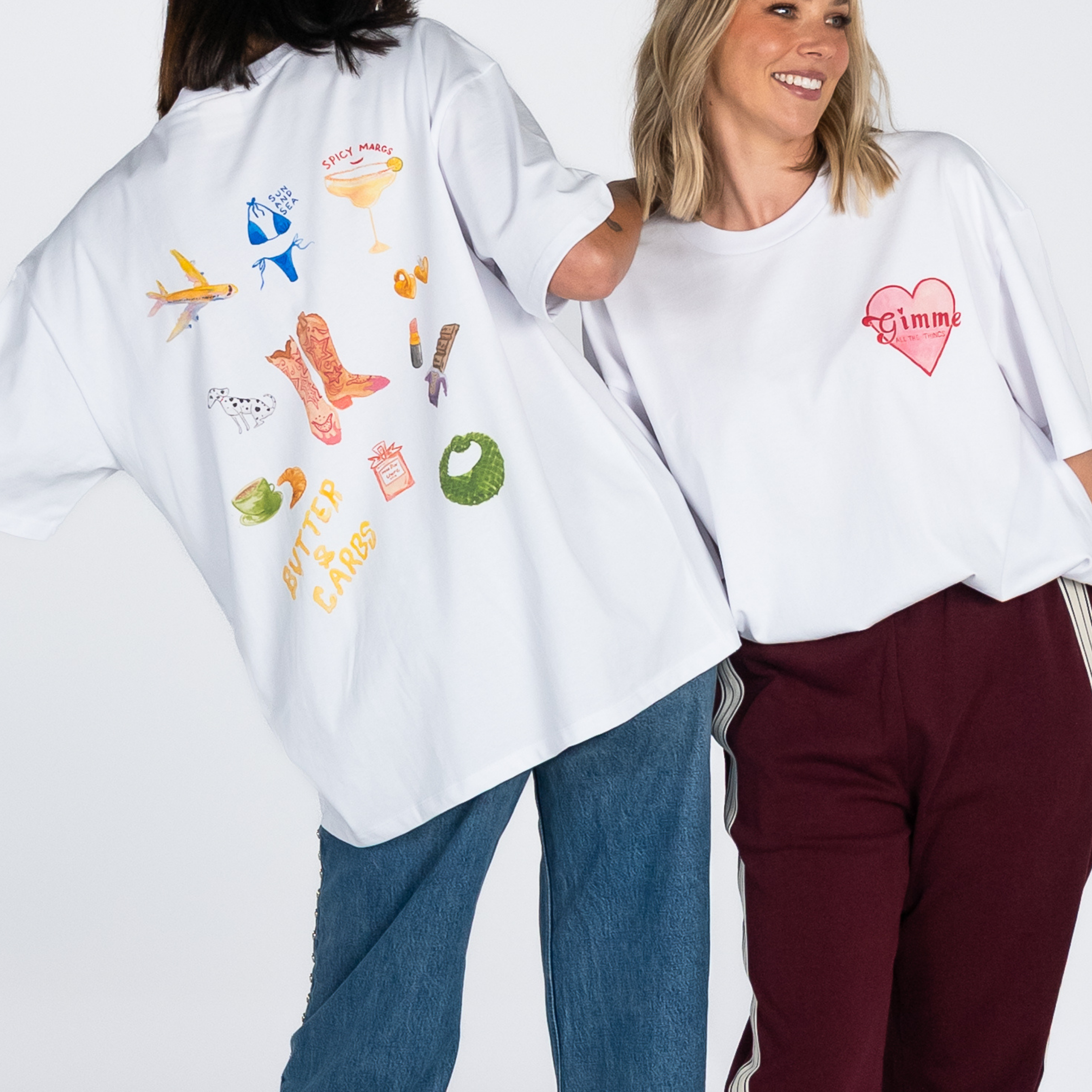 This limited edition collab tee with artist Maku is a love letter to life’s guilty pleasures; the spicy marg, the perfect croissant, the last-minute getaway. On the front, a custom emblem spelling out Gimme All The Things. On the back? A gallery of Maku’s playful hand-drawn icons; perfume, cowboy boots, coffee, our iconic Lisa Puffy Heart Earrings and more.