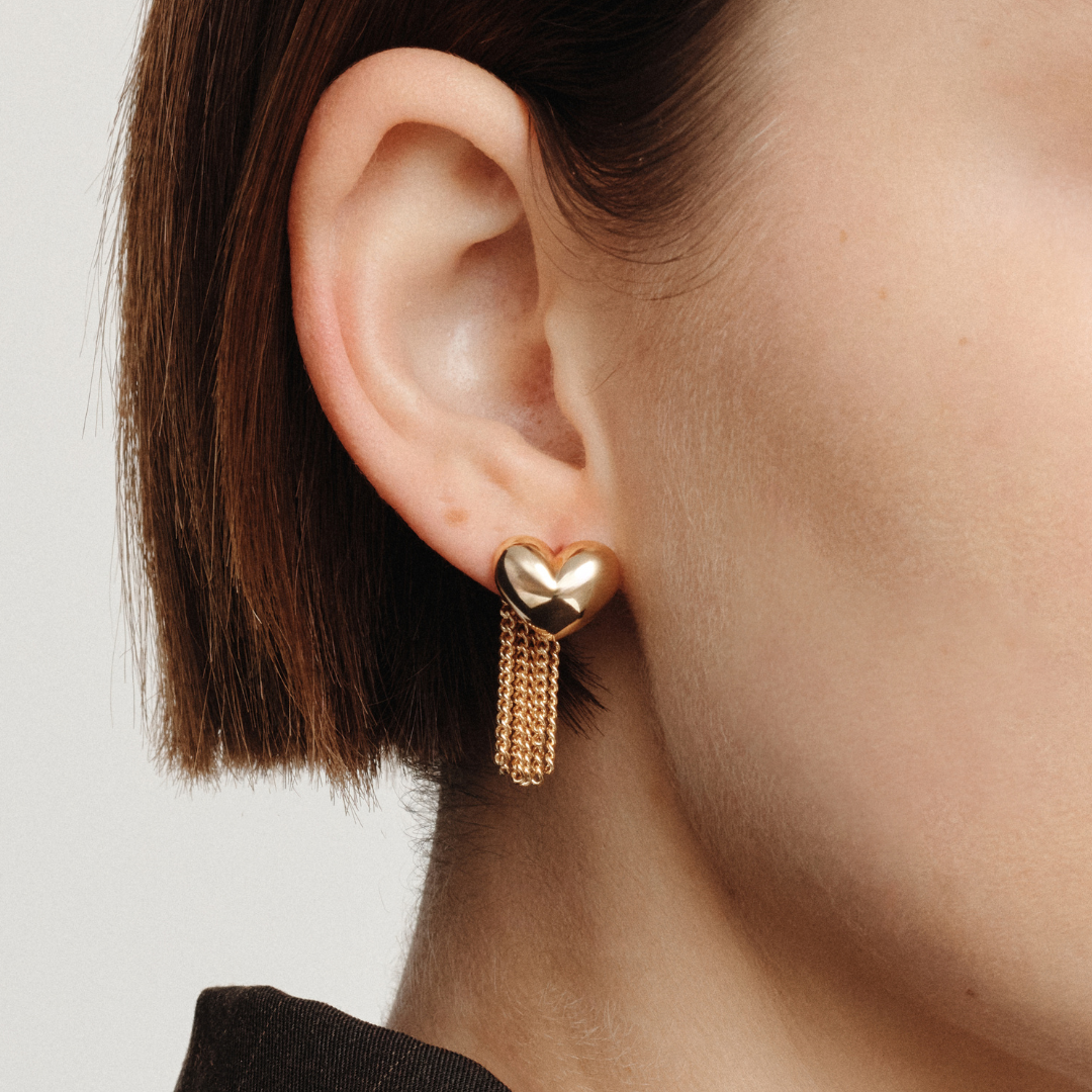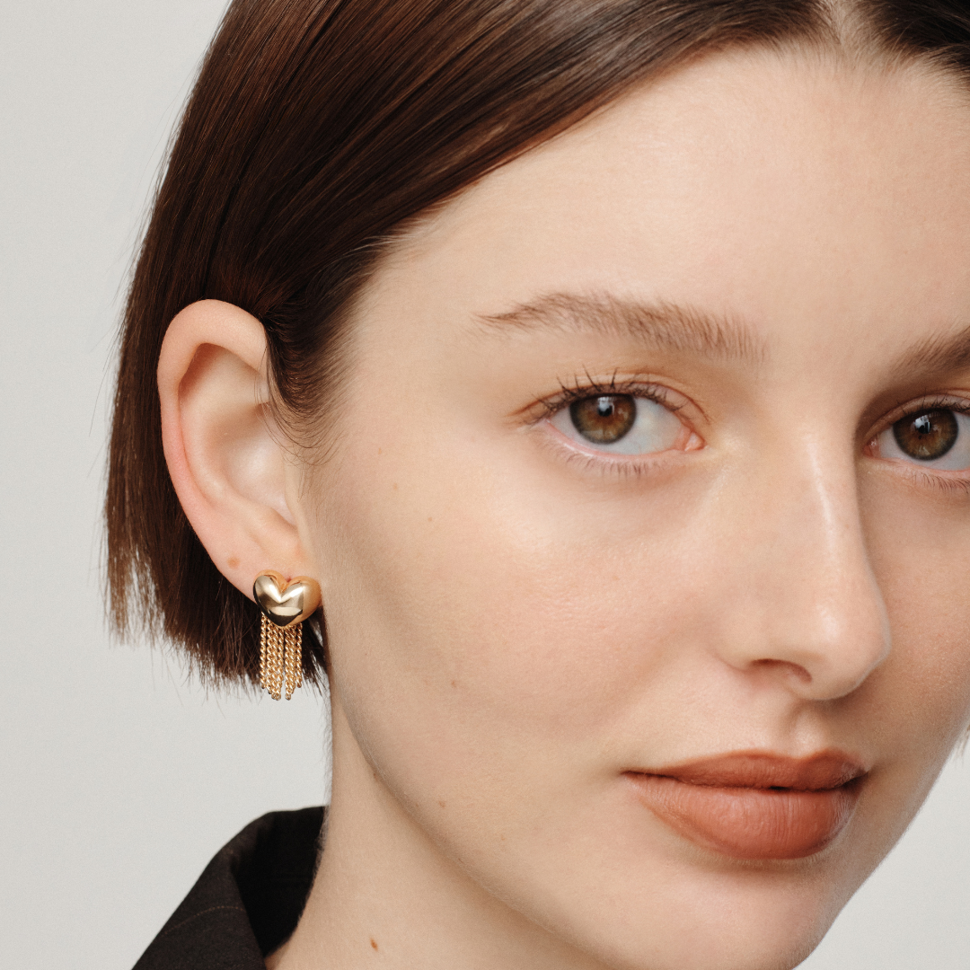 The Paris Earrings are a love letter to bold styling featuring puffed heart studs with a detachable rainfall chain back. Wear them two ways: go full drama with the cascading fringe, or keep it simple with just the puffed heart as a standalone stud.